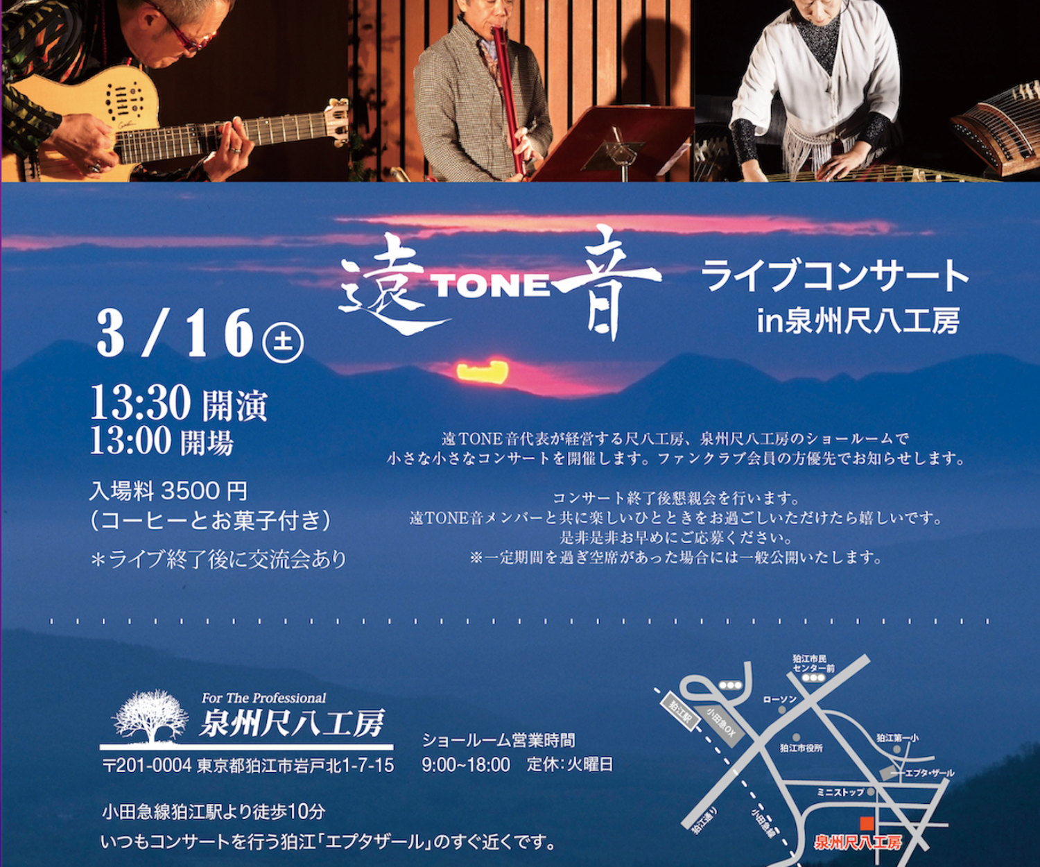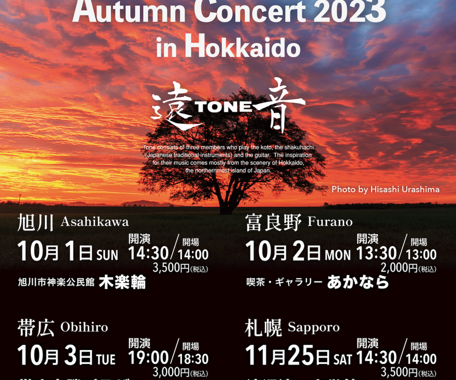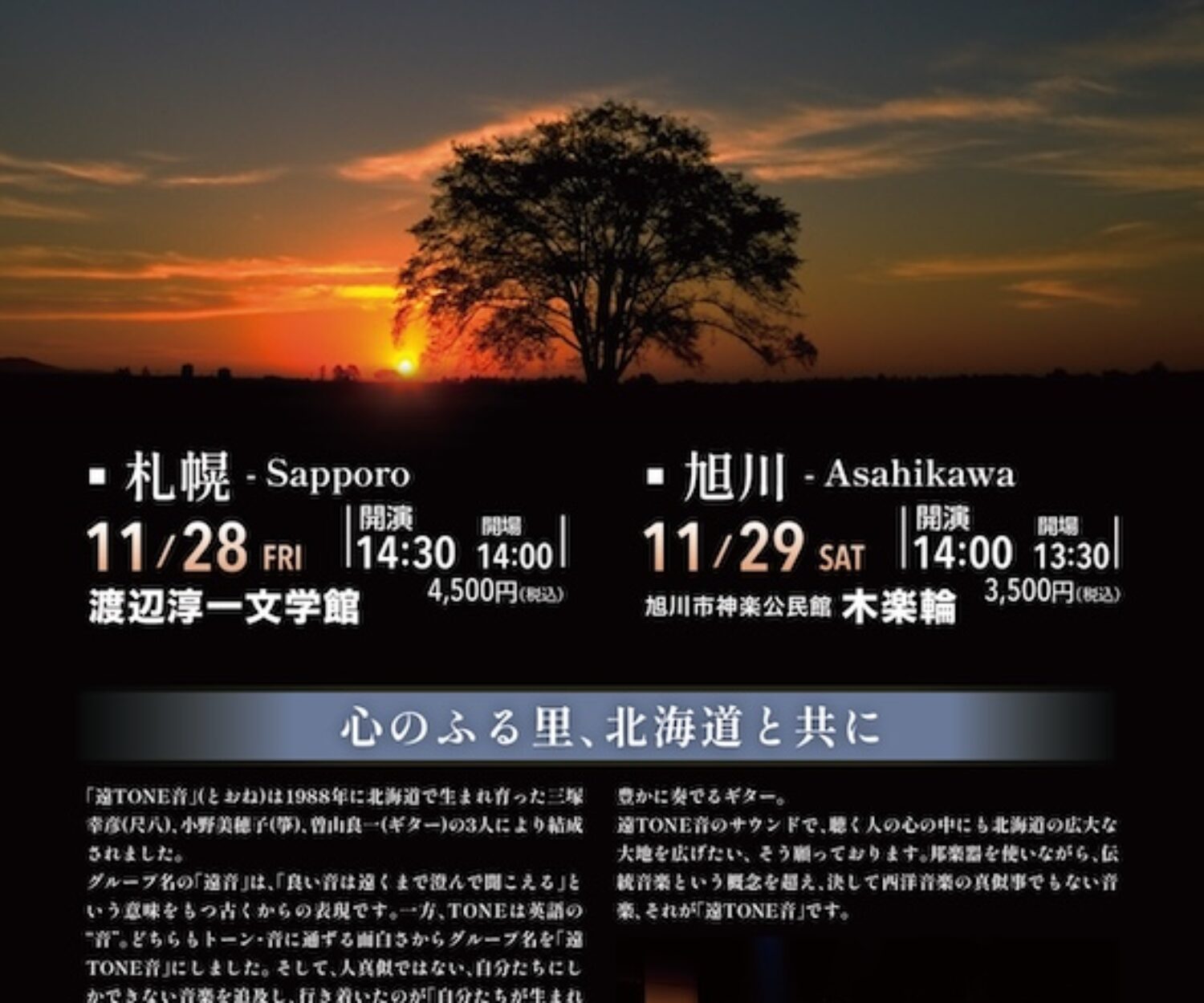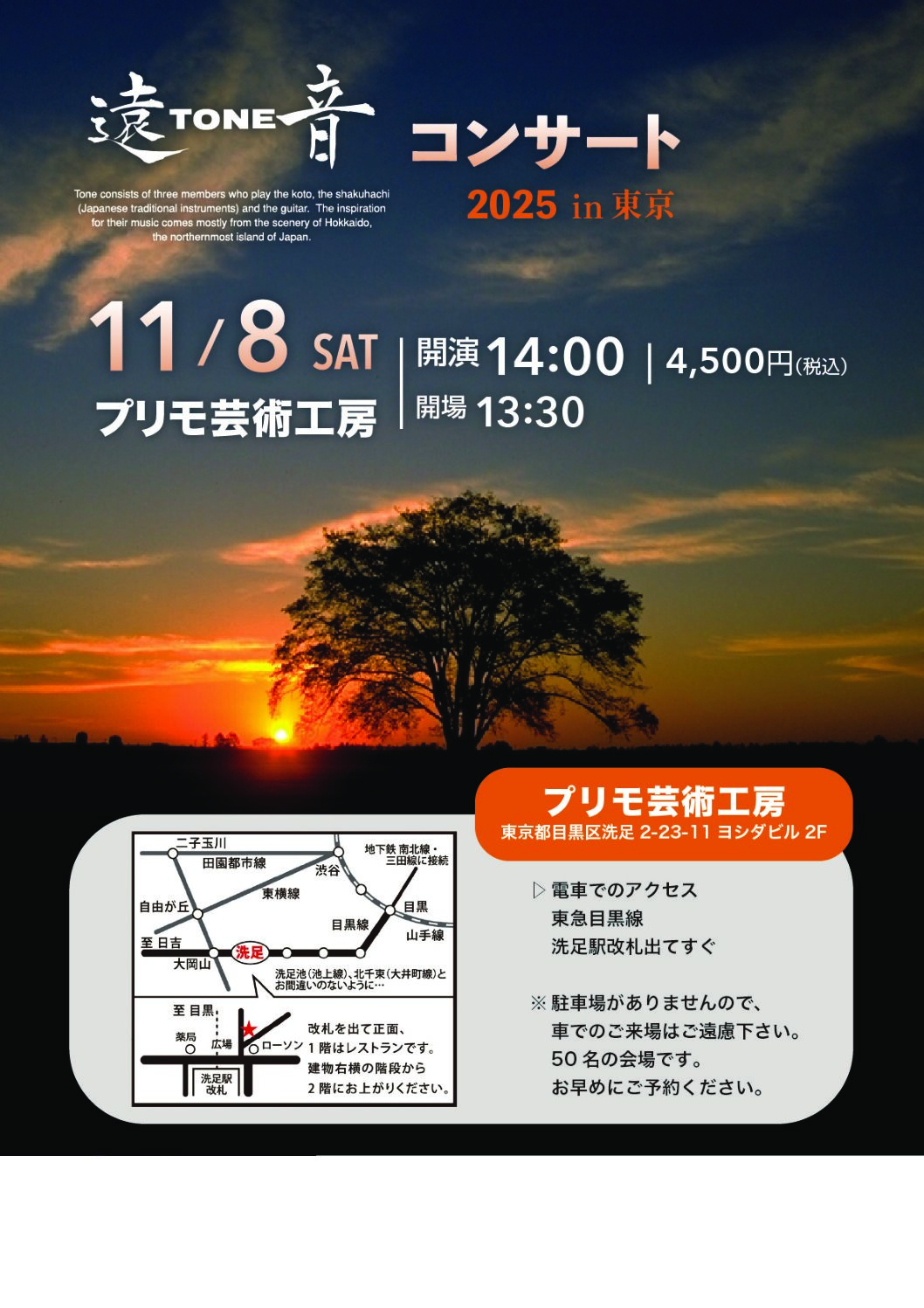 東京、北海道で 遠TONE音「初夏のコンサート」を開催します。 一年中で最も爽やかな初夏の光の中で遠TONE音サウンドを是非お聴きください! 5月25日(土)14:00開演 東京洗足「プリモ芸術工房」(東急目黒線、洗足駅改札出てすぐ、2階)https://primoart.jp/access/ 6月1日(土)14:30開演 旭川「木楽輪」(神楽市民交流センター)https://www.google.com/maps/place/43°45'38.7%22N+142°20'58.2%22E/@43.760749,142.349509,15z/data=!4m4!3m3!8m2!3d43.7607494!4d142.349509?hl=ja&entry=ttu 6月2日(日)14:30開演 札幌「渡辺淳一文学館」https://watanabe-museum.com/access.html チケット購入は https://tone-take1.shop-pro.jp/?mode=grp&gid=2708674
