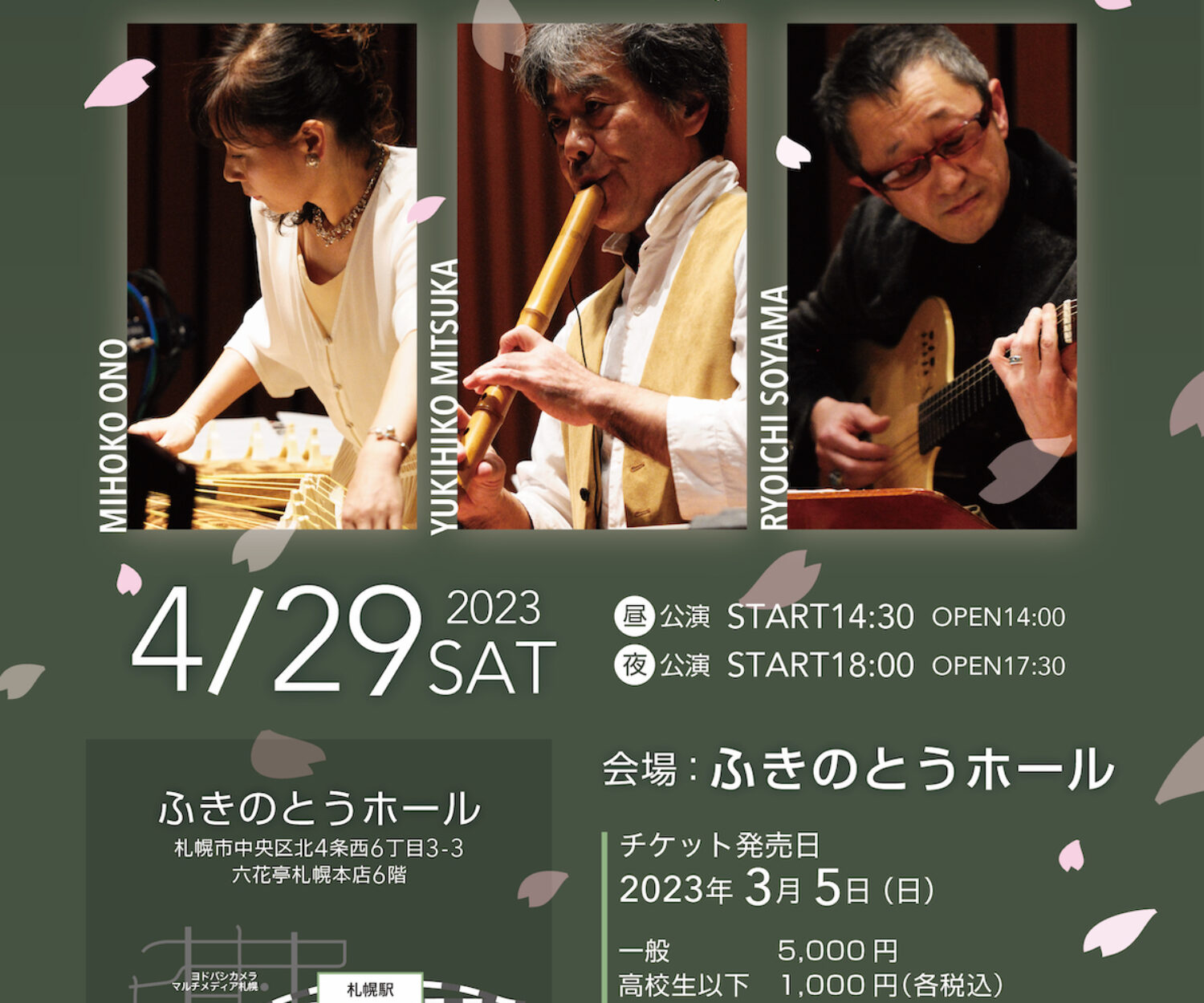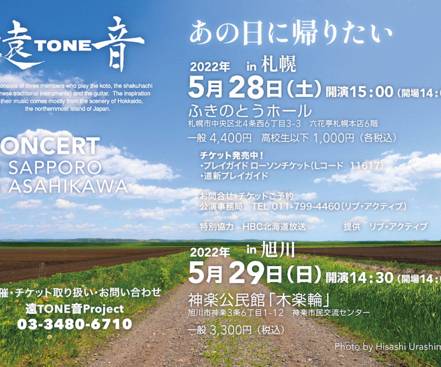 News 07 3月 2023 春のコンサート in Sapporo 決定 遠TONE音 Spring CONCERT 詳細決定 2023年4月29日(土)札幌。遠TONE音「春のコンサート」を開催します。 会場 ふきのとうホール 札幌市中央区北4条西6丁目3-3 六花亭札幌本店6階 昼夜2公演 昼の部 Open14:00 START14:30 夜の部 Open17:30 START18:00 一般 5,000円 高校生以下 1,000円(各税込み) 全自由席 ローソンチケット(Lコード:12417) 道新プレイガイド(セコマコード:D23042905) 主催 リブ・アクティブ 協力 ステージマインド 企画 遠TONE音Project お問い合わせ 公演事務局 011-799-4460 Mitsuka