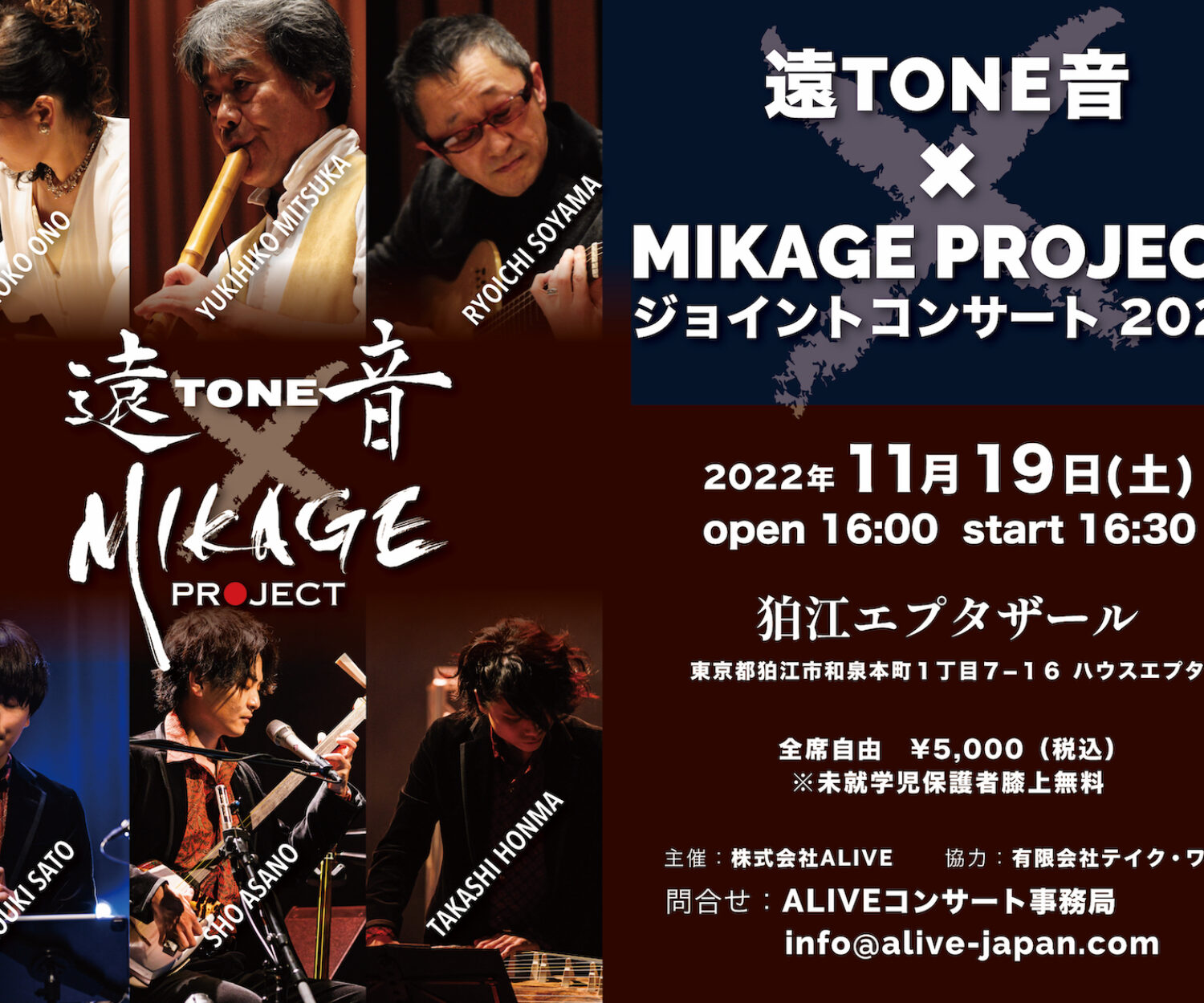 News 03 9月 2022 遠TONE音コンサート東京 11月19日(土)決定! 遠TONE音コンサート東京が決定です! 今回は若い邦楽器グループ「MIKAGE PROJECT」との共演です。 遠TONE音はそのグループ名の通り「音=TONE」にこだわりを持ったグループです。 その遠TONE音がついに「これはちょっとやられたかも!」と思えるサウンドを繰り出すチームに出会い、ラブコールを送ったところ快諾いただきました。 「MIKAGE PROJECT」は民謡を作り直す、創作するというようなコンセプトで、メンバーは民謡の専門家でもあります。澄み切った歌声と三味線、それに、実は遠TONE音の三塚と同じ尺八、美穂子と同じピックアップマイクを使ったサウンドは遠TONE音35年間の活動を確実に吸収そして高度に進化させた「TONE」と言えるでしょう! 早めのご予約をどうぞ! 遠TONE音 ☓ MIKAGE PROJECT ジョイントコンサート2022 2020年11月19日(土) 東京・狛江エプタザール東京都狛江市和泉本町1-7-16 open 16:00 start 16:30 全自由席 ¥5,000-(税込み) Mitsuka